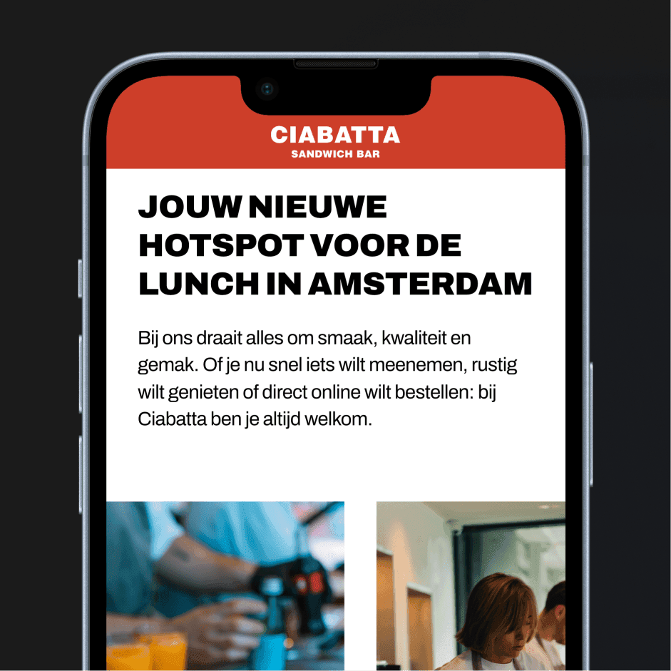 Voor Ciabatta hebben we een moderne, visueel sterke website ontworpen en gerealiseerd waarin de gedurfde en stoere huisstijl centraal staat. De fotografie van de broodjes en het interieur krijgt de ruimte om authentiek te spreken, waardoor bezoekers direct een gevoel krijgen van smaak en beleving.